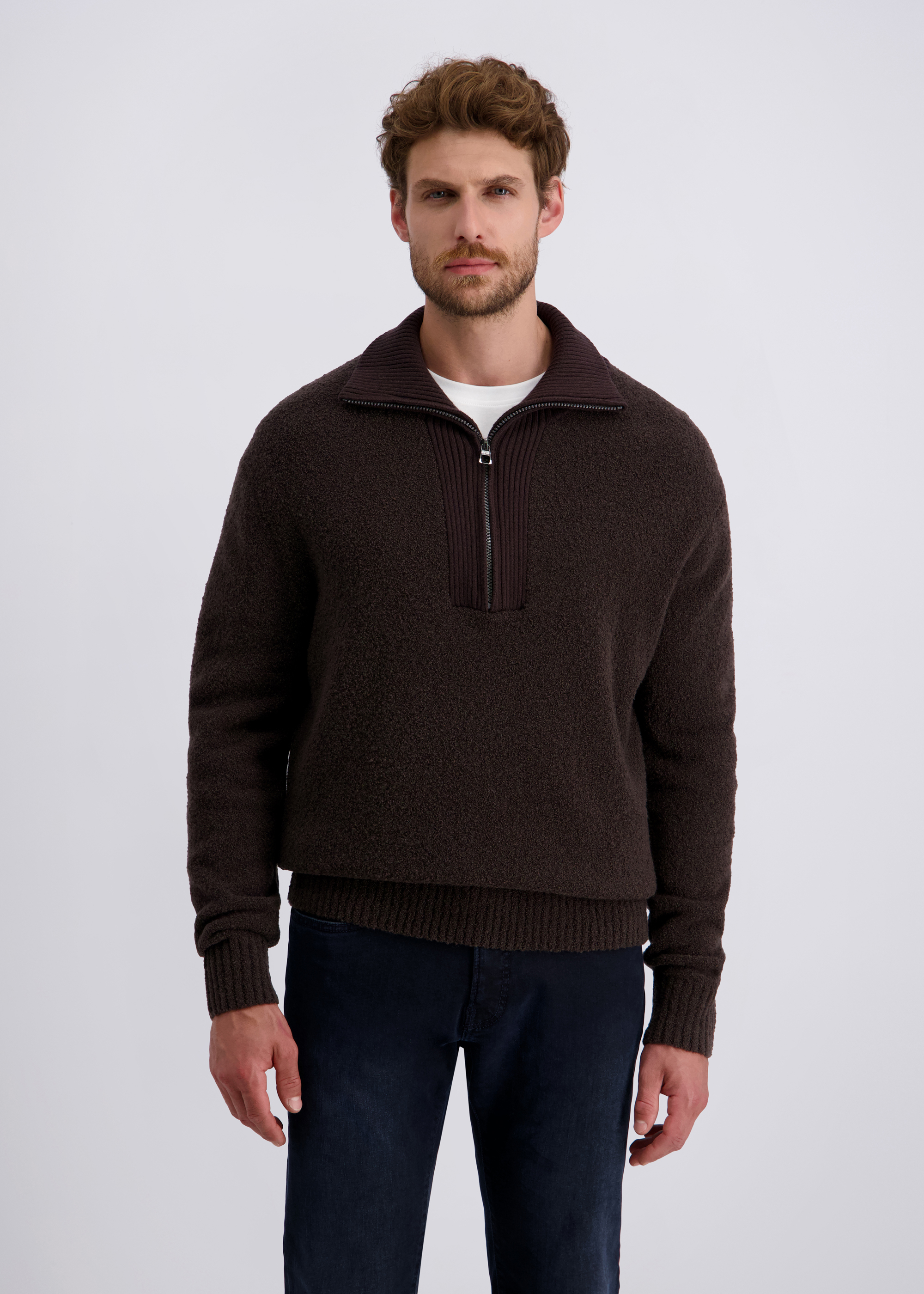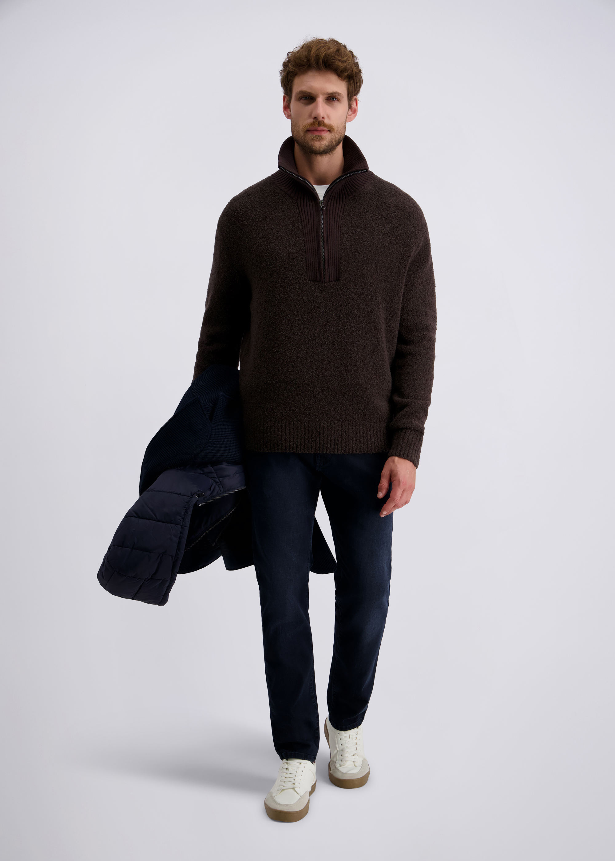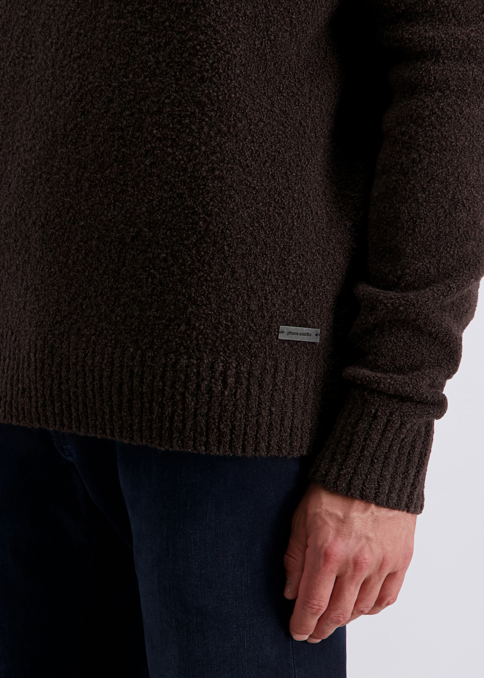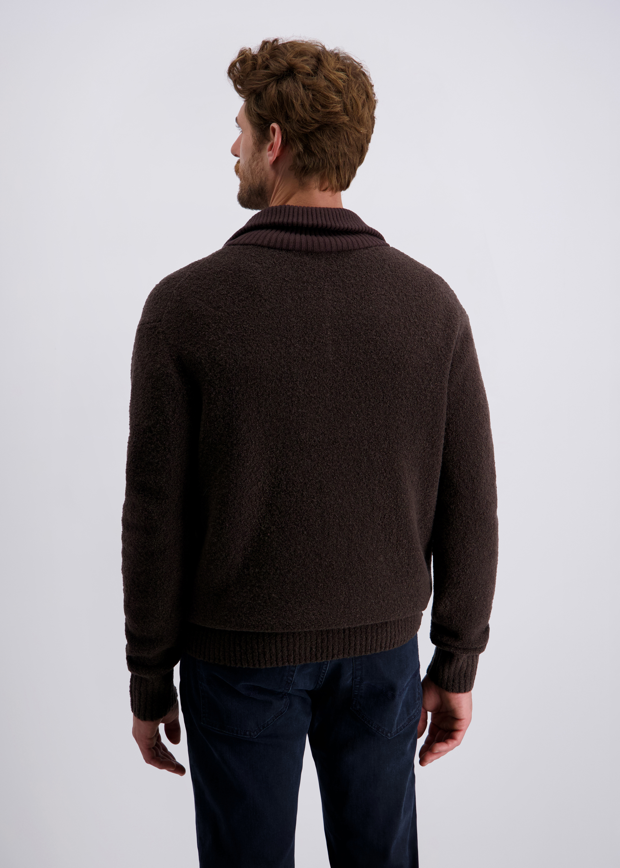 - Hochwertiges Bouclé Garn für modisch anspruchsvollen Strick kombiniert mit einem Baumwoll Mischgarn für den Kragen